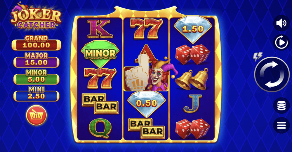 The Joker catch feature is activated when diamond or jackpot symbols land on a position within the catch frames. During this feature, the Joker collects prizes from these symbols and adds them to the total win.